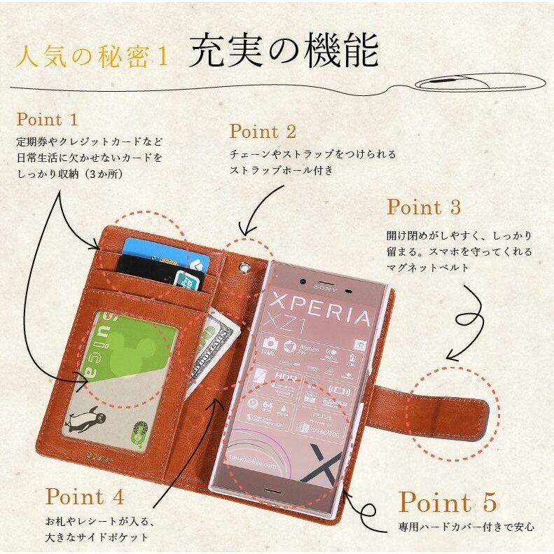 専用の手帳型カバーのスマホケースです。クリスタルストーンのポイントデコが大人可愛いデザインデザインもあります。